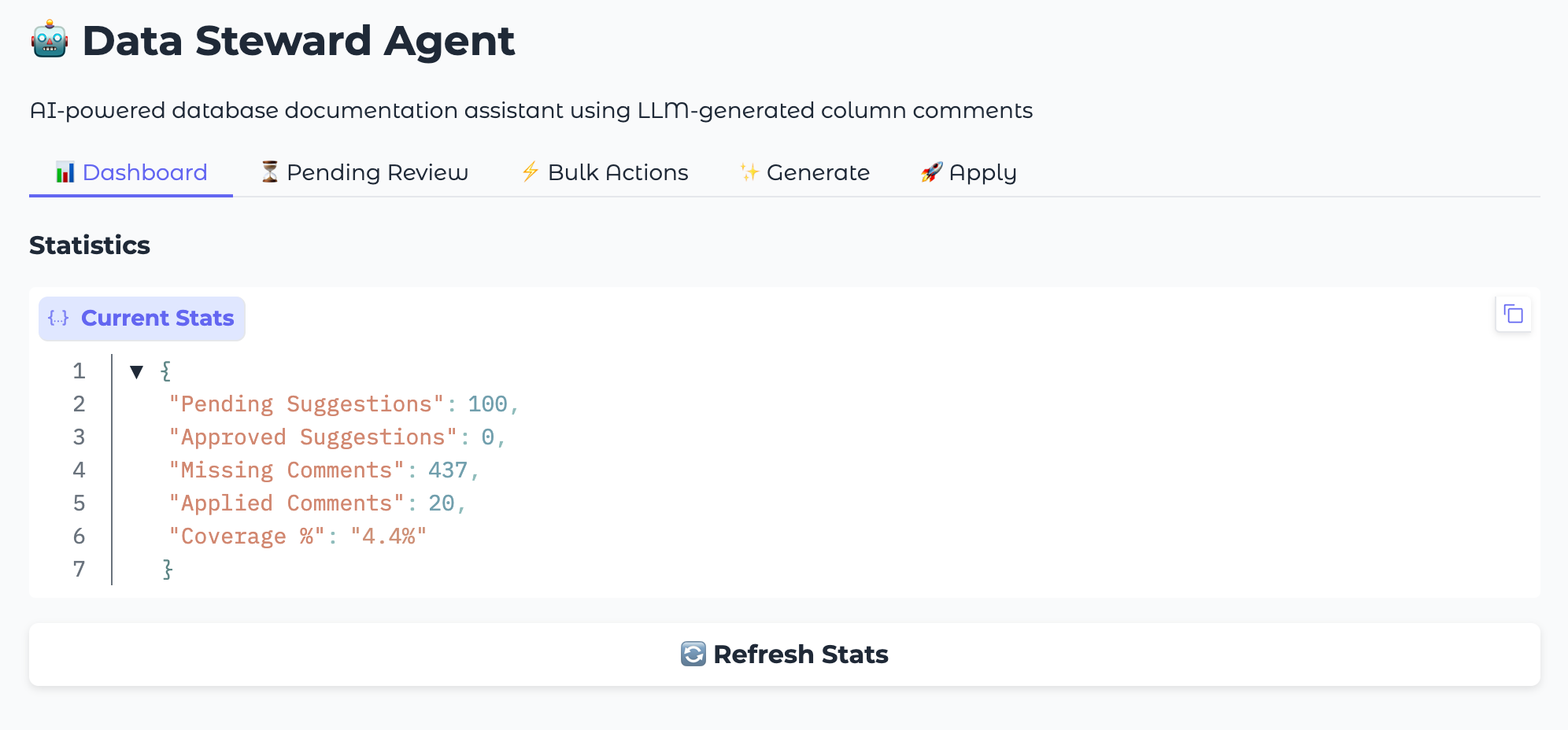 For a more interactive experience, the Data Steward Agent includes a Gradio-based web interface that provides a visual dashboard for managing metadata suggestions.