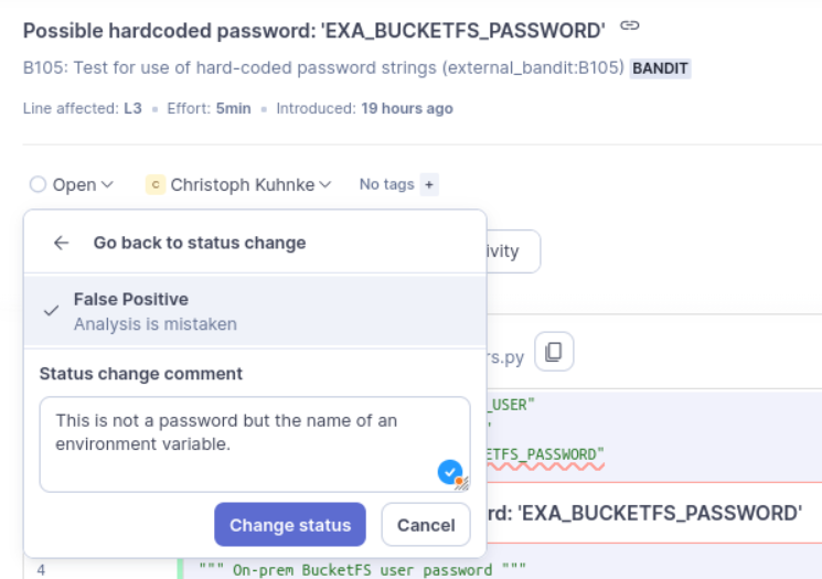 In rare cases, Sonar might report a finding, you cannot fix or on which you can agree with your reviewers to accept or ignore it. Please only choose this approach as a last resort.